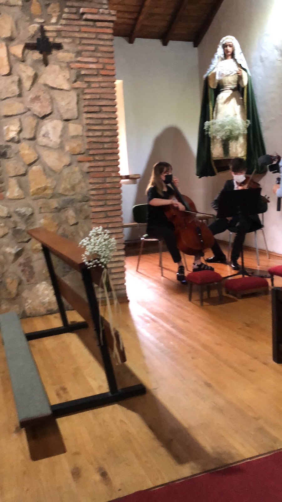 Habíamos entrado en la gloria, una música celestial surgía de un pequeño rincón, donde dos ángeles dejaban sobre sus instrumentos respectivos violín y violonchelo, el desliz de sus arcos, haciéndoles vibrar las cuerdas, detrás la Virgen se sentía dichosa contemplando la entada libre al empíreo divino. No lo podíamos dudar estábamos en el paraíso, habíamos entrado en la gloria. Hasta el Cristo con su cruz nos decía: "dejad fuera vuestras cruces, esas que todos lleváis en el caminar diario".